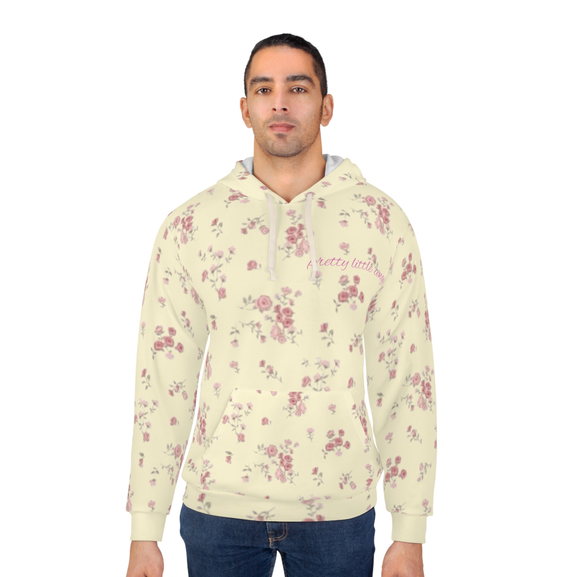 Soft, vintage-inspired florals dust the fabric like a memory of sunlit afternoons. This hoodie wraps you in lightweight warmth and nostalgic charm — roomy enough to curl into with a book, and detailed with a roomy kangaroo pocket for cold hands or scattered notes. The hood’s adjustable drawcord lets you cocoon through brisk mornings, while the all-over print keeps the delicate rose pattern uninterrupted from front to back. Subtle scripted text on the chest and a larger heartfelt message across the back make it feel personal, like something passed down between friends. Wear it to slow afternoons, small gatherings, or days when you want comfort that reads like a gentle reminder to yourself.